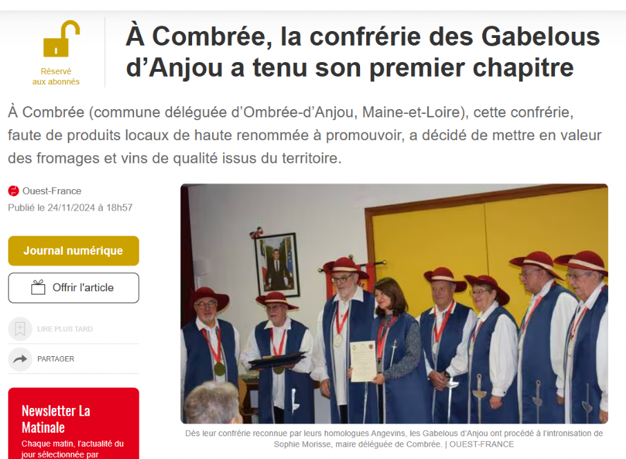 Samedi 16 novembre, dans la salle du conseil municipal à Combrée (commune déléguée d’Ombrée-d’Anjou, Maine-et-Loire), devant un parterre de sympathisants et de membres de confréries, commanderies ou d’académies des Pays de la Loire, les Gabelous d’Anjou ont fait leur entrée dans la grande famille des défenseurs et promoteurs d’un produit, d’un territoire, avec la tenue de son premier chapitre.